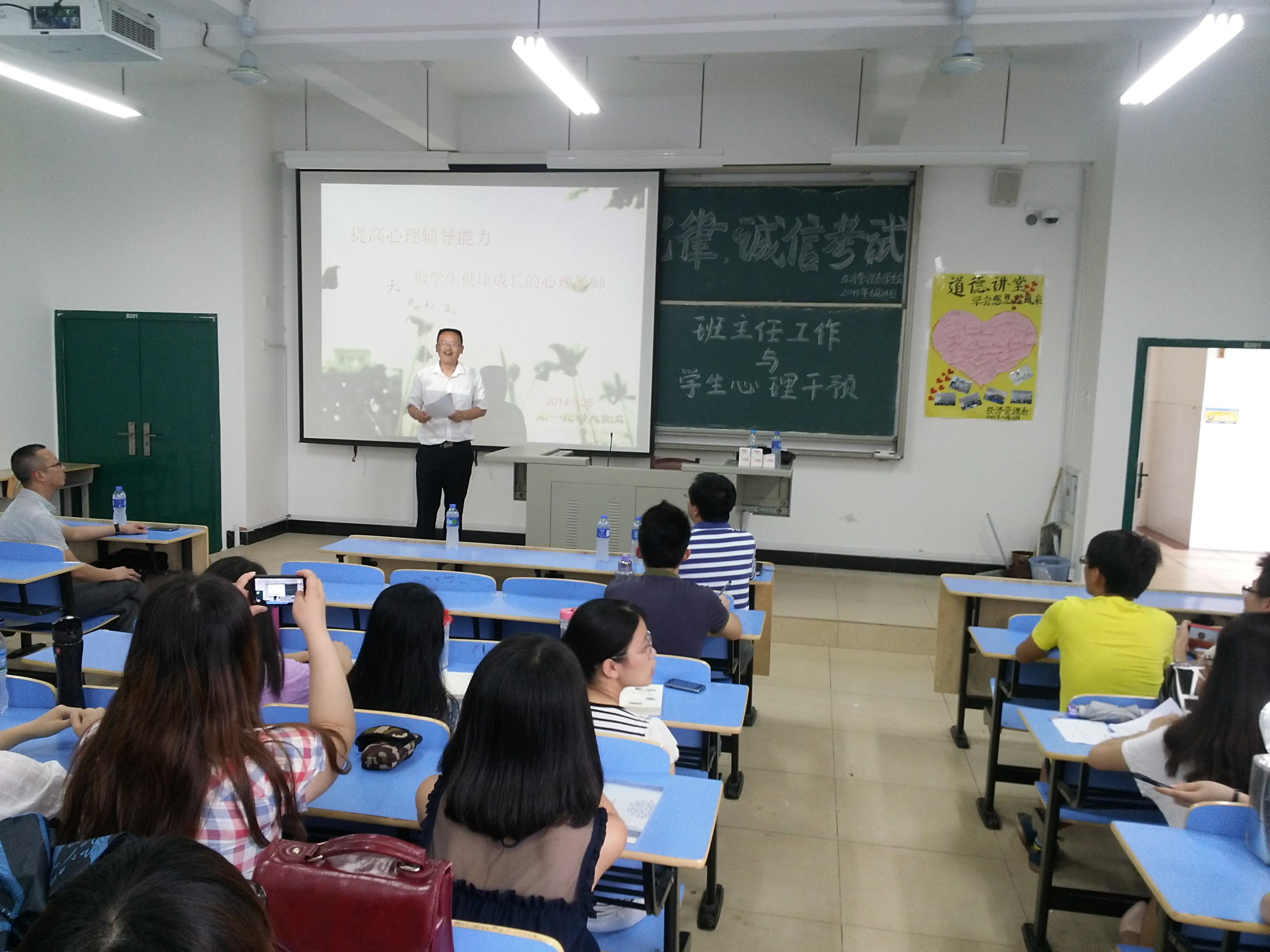 为了帮助我系即将实习的员工了解班主任的工作并且能在今后成为一名合格、优秀的班主任。2014年6月25日我系在BB201举办了主题为“班主任工作与员工心理干预”的讲座,邀请了宁德市屏南华侨中学副董事长、高级教师张长武作为主讲人。经济管理系党总支书记游国斌、经济管理系党总支副书记周建辉、江容眉等老师以及我系即将实习的员工到场参加。本次讲座由游国斌教授主持。