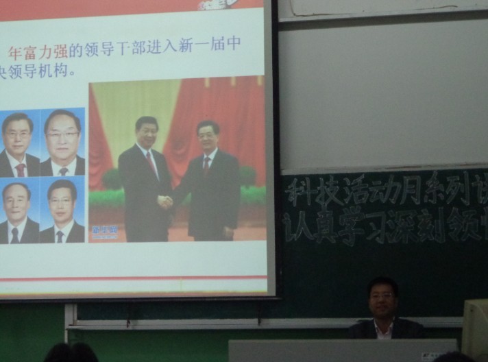 系主任游国斌教授开门见山地总结了党的十八大之前我国所获得的各项成绩,指出在全球化的背景下,中华民族在中国共产党领导下走出了一条以改革开放和社会主义现代化建设为实践基础的、以中国特色社会主义为奋斗旗帜的、以中国特色社会主义理论体系为指导思想的完全新型的现代化道路。