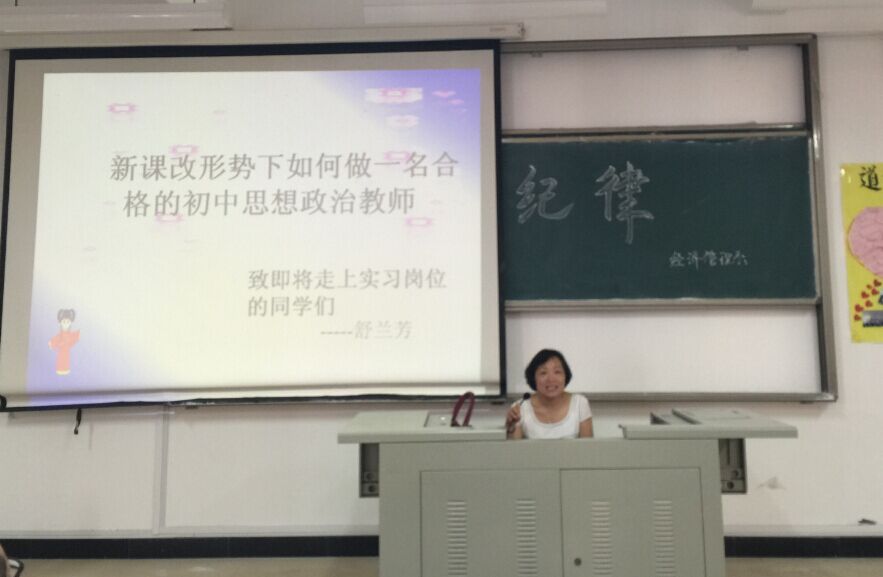 经管系党总支副书记周建辉老师希望同学们通过今后的实习走上教师岗位的时候能够“站的挺拔,讲的漂亮”;能够认真对待实习,珍惜每一次授课的机会。舒兰芳老师以“新改革形势下如何成为一名合格的老师”为主题开展本次的讲座,她紧扣主题,内容新颖独特,极受同学们的青睐。林颖老师对舒兰芳老师的讲座进行总结讲话,并预祝同学们实习圆满成功。