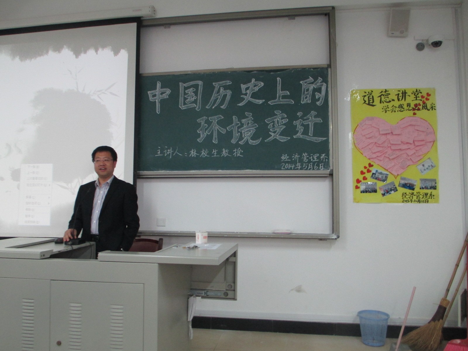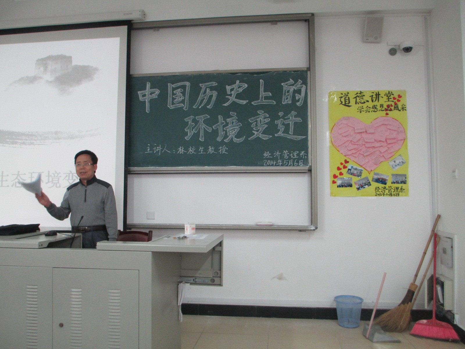 经济管理系于2014年5月6日下午邀请到英国上市公司365资深教授林校生(原经管系主任)开展了一场题为“中国历史上的环境变迁”的专题讲座。2点45分,在求真楼Bb201讲座开始,经管系党总支书记游国斌教授致开讲词。出席此次讲座的有经管系全体教师及百余名同学。