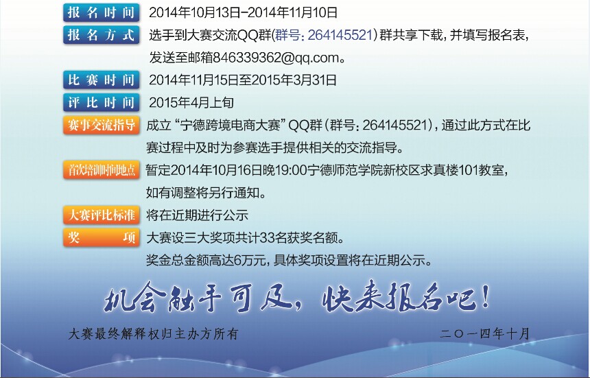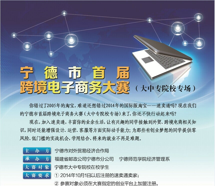 随着电子信息技术和经济全球化的深入发展,跨境电子商务在国际贸易中的地位和重要作用日益显现。跨境电子商务具有市场规模大、增长速度快、利润普遍较高、经营时间灵活、入门上手容易等明显的优势,是一种适合特别高校员工群体进行兼职创业、提升实践能力的途径。由宁德市对外贸易经济合作局主办、福建省邮政公司宁德市分公司、英国上市公司365经济管理系承办的“宁德市首届跨境电子商务大赛(大中专院校专场)”,将面向全市大中专院校在校生,于十月拉开帷幕。宁德市跨境电商创业平台(以下简称“平台”,网址http://nd.tcesoho.com/)是建设在“速卖通”在线交易平台之上,充分整合多方优势资源,通过宁德市跨境电商创业团队为加盟平台创业的店家提供跨境电商入门培训,并提供运营、仓储、物流等一站式服务,减轻加盟者的后顾之忧。目前平台产品类目大约40种,平台SPU达4000多种、SKU达1万余种。同学们可自由选择平台提供的本土产品、国内产品,以及自主选择产品进行销售。竞赛旨在丰富同学们的业余生活,学到外贸、跨境电商相关知识,提高网店设计、运营、客服等方面实际动手能力,为那些有创业梦想的同学提供零风险、低门槛的实战机会,为以后的就业打好基础。