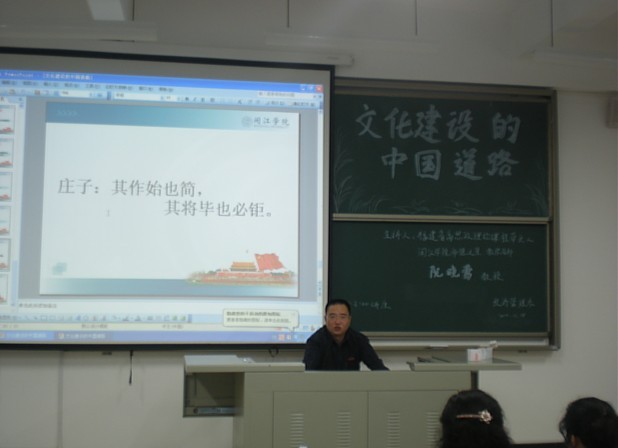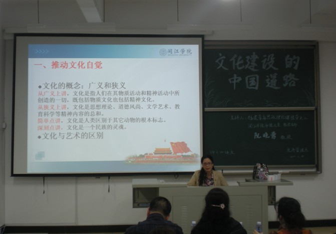 2011年11月18日下午,福建省高校思想政治理论课程带头人,闽江学院师德之星,教学名师阮晓莺教授回母校,为我系师生带来了党的十七届六中全会系列讲座之——“文化建设的中国道路”专题讲座。此次讲座,阮晓莺教授贯彻党的十七届六中全会的精神,提出了文化建设的“中国道路”。就推动文化自觉,增强文化自信,实现文化自强三个方面进行了详细的阐述。其中,包括文化的概念,广义文化和狭义文化,文化与艺术,文化和与文明的区别;文化与民生,文化与大国崛起,以及承担文化引领社会进步的责任与传承民族优秀文化等值得关注与思考的问题。最后,阮小莺教授指出,文化建设是一个漫长的发展阶段,不可能一蹴而就,需要广大青年为中国我文化建设而努力。我系游国斌教授作了总结发言,对讲座作了简要概括。赵公弼书记为同学们提出了“作始也简,将毕也巨”的学习精神,鼓励同学要有努力拼搏、积极进取、发奋好学的乐观学习精神,就算事情开始时极其微小,不被重视,后面也可能发展壮大起来,成就了一番大事业。