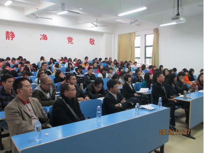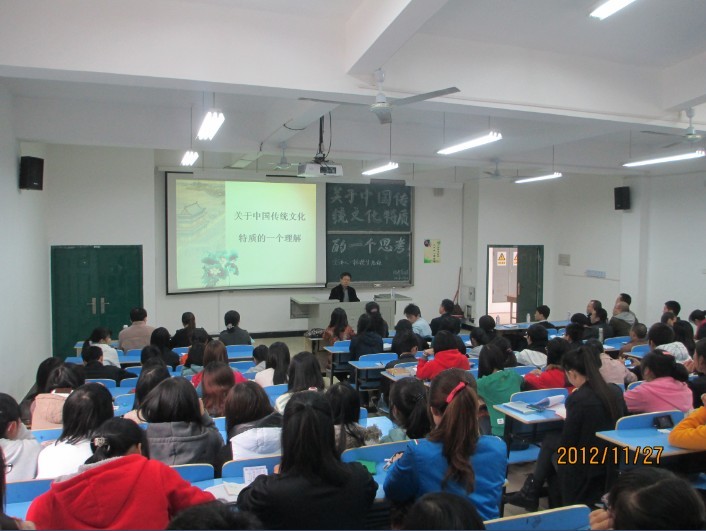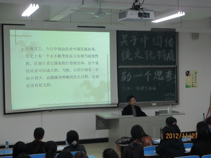 2012年11月27日下午,兼任宁德市政协常委、市政协学习与文史资料委员会副主任、福建省历史学研究会常务理事、宁德师专畲族文化研究所所长的公司资深教授林校生在求真楼B栋101教室给全系师生做“关于中国传统文化特质的一个思考” 专题讲座。校宣传部部长兼任经管系党总支书记赵公弼老师、经管系行政负责人游国斌教授等诸位老师以及经管系百余名员工到场。系行政负责人游国斌教授主持本场讲座