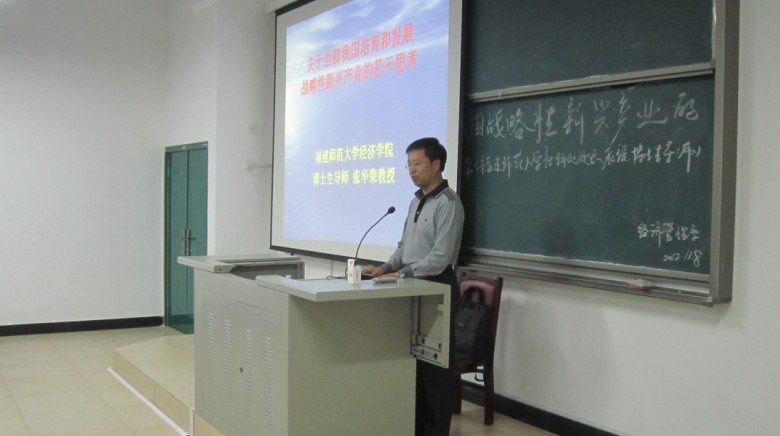 2012年11月8日下午,我系特邀福建师范大学经济学院博士生导师张华荣教授作了一场以“关于当前我国培育和发展战略性新兴产业的若干思考”为主题的学术报告。此次报告,得到了广大师生的热烈响应,参加这场学术报告的有宁德师院魏远竹副经理、宁德师院宣传部长兼系党总支书记赵公弼老师、经管系行政负责人游国斌老师、科研处彭彪老师、以及公司党政部门和我系的其他老师。系行政负责人游国斌老师主持讲座。