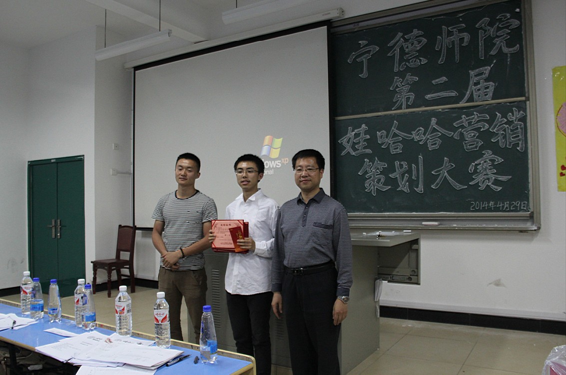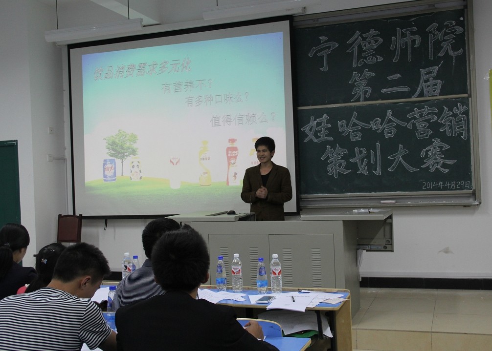 2014年4月29日晚七点,经管系成功举办了宁德师院第二届娃哈哈营销策划大赛总决赛,通过激烈角逐产生了一二三等奖。各个团队通过两个学期的努力,不仅交出了漂亮的策划书,更通过各种创意促销活动,体验了真枪实弹的商海残酷,最为重要的是,在竞赛中学会了团队协作、沟通,提升了组织纪律性、集体荣誉感。同学们付出了艰辛的努力,他们的身影出现在校园里、街道上、公园旁,各位同学都受益匪浅,有坚持、有创新、有努力、有收获。在娃哈哈集团宁德分公司的大力支持下,在大家的努力下,此次营销策划大赛完美落幕!