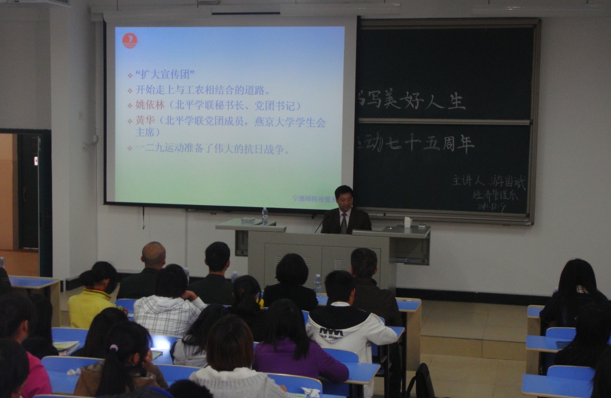 12月9日,我系举办了一场由我系游国斌教授主讲的“坚持学习实践,书写美好人生——纪念一二九运动75周年”专题讲座。本校师生和宁德市消防大队官兵听讲本次讲座。游国斌教授对“一二九运动”的历史做了详细的介绍,并教导同学们坚持学习实践,书写个美好人生。