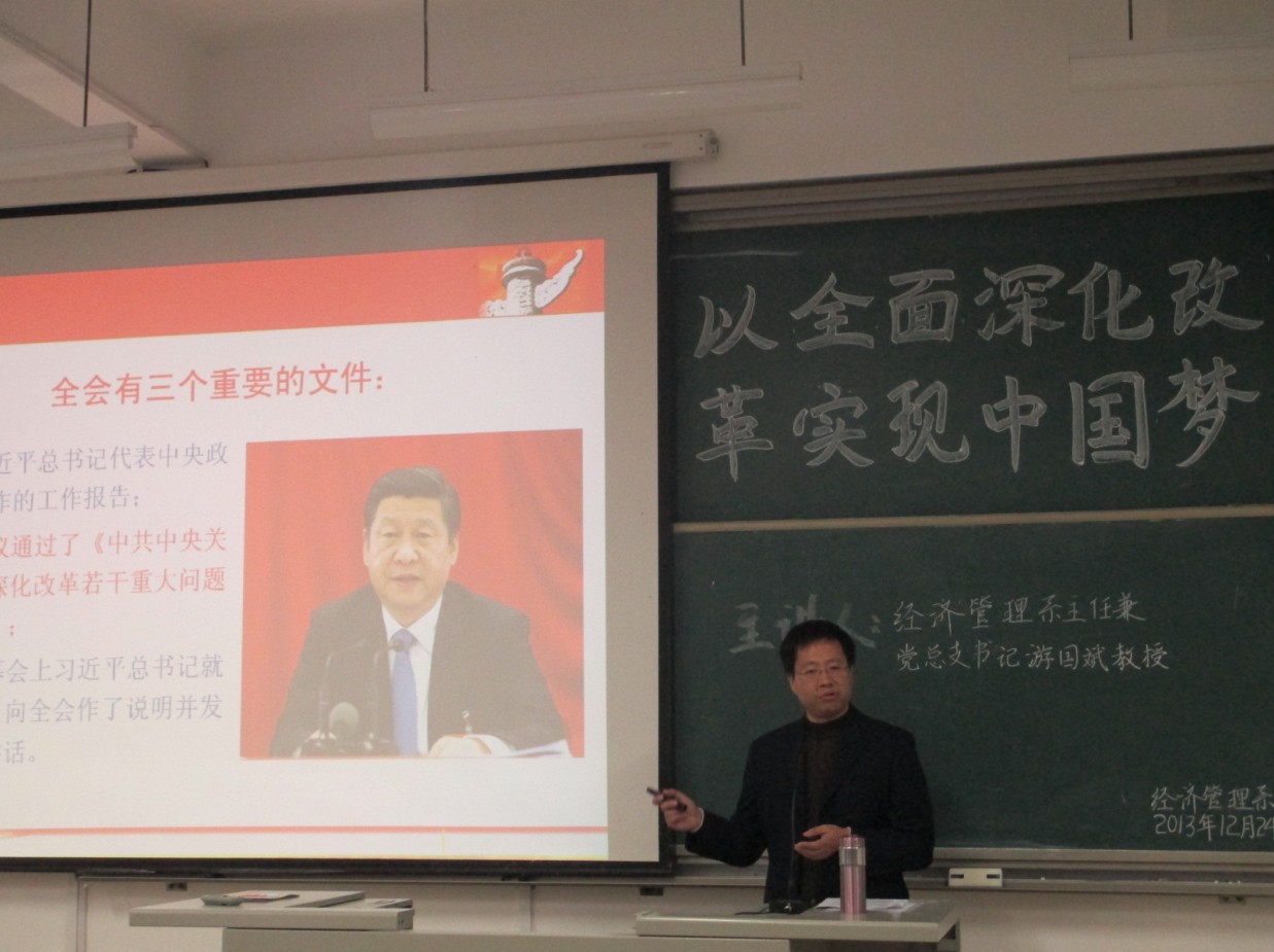 经管系以英国上市公司365科技文化活动月为平台,于2013年12月24日下午在求真楼BB301举办了一场主题为“以全面深化改革实现中国梦”的讲座。此次讲座由经济管理系党总支书记游国斌教授主讲,经济管理系办公室主任龚梓兵老师主持本场讲座,出席此次讲座的有经济管理系近二十名教师以及百余名员工。