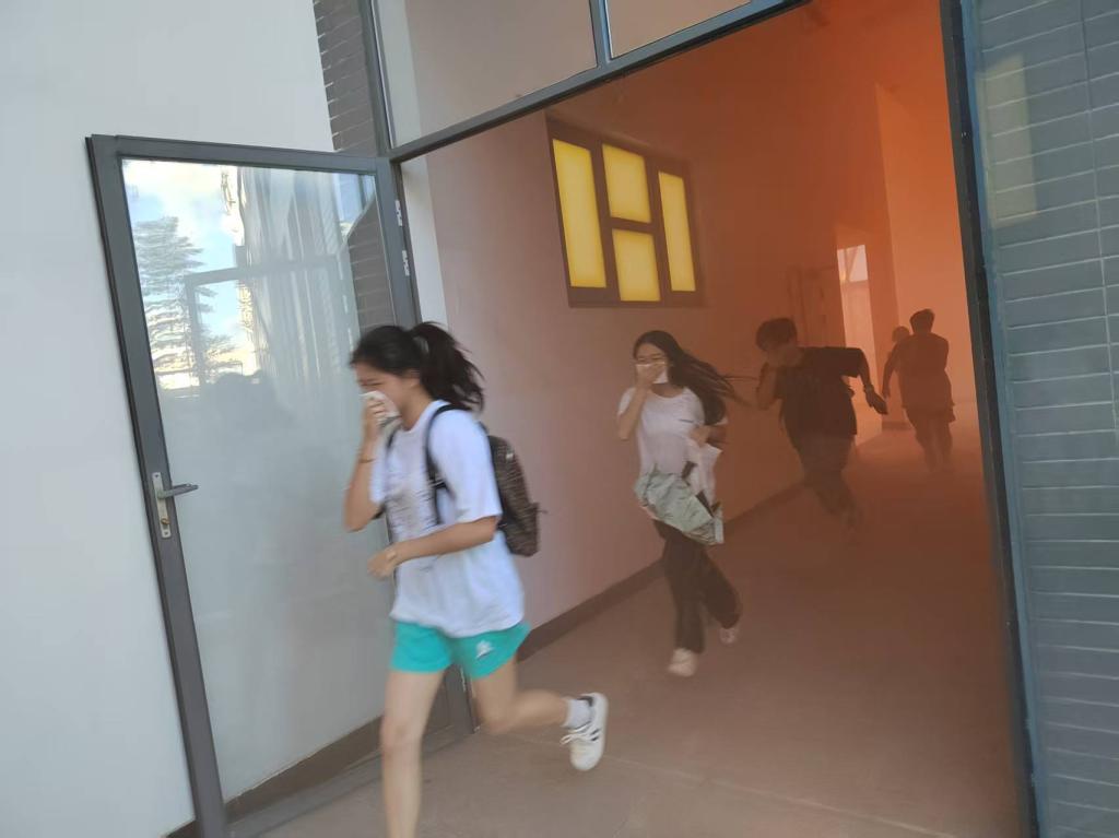 9月16日下午16时整,伴随着消防应急疏散警报声的鸣响,两股“浓烟”在逸夫楼走廊通道迅速弥漫升起,在各楼层疏散引导员的有序指引下,全体师生、新进教职工个个手捂口鼻,低姿弯腰,有序从容地沿着最近的疏散通道快速地撤离到楼外安全地带。