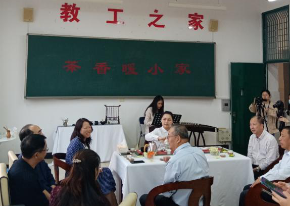 在悠扬的古筝琴声中,参会教职工用茶籽粉净手入座,茶叙会正式开始。茶师通过翻杯—温杯洁具—赏茶—投茶—温润泡—注水—出汤—分汤—奉茶—品茗—收具等一系列茶艺步骤演示了茶叶冲泡的基本流程,让教职工了解茶品的色香味和功效。教职工们环坐其中,感悟茶香馥郁,分享饮茶心得。