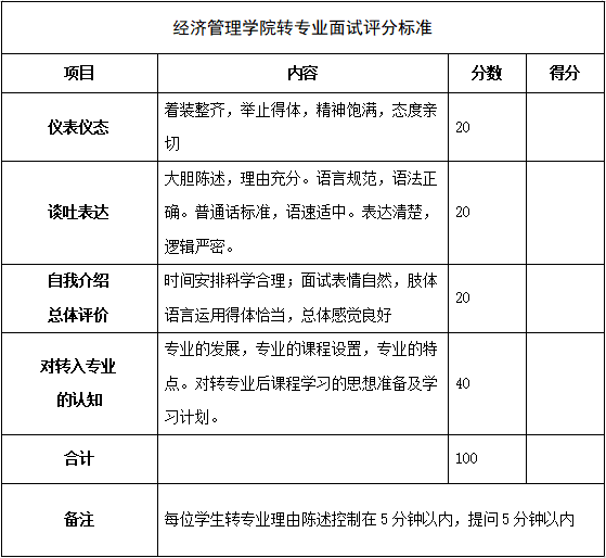1.转专业考核总分由第一学期专业排名百分值和面试组成,总分=面试成绩×30%+(100-专业排名百分值*100)×70%,按总分从高到低录取。