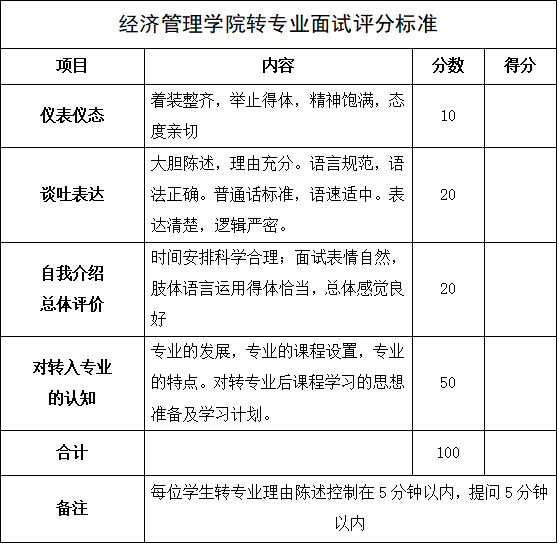 1.转专业考核总分由第一学期专业排名百分值和面试组成,总分=面试成绩×30%+(100-专业排名百分值*100)×70%,按总分从高到低录取。