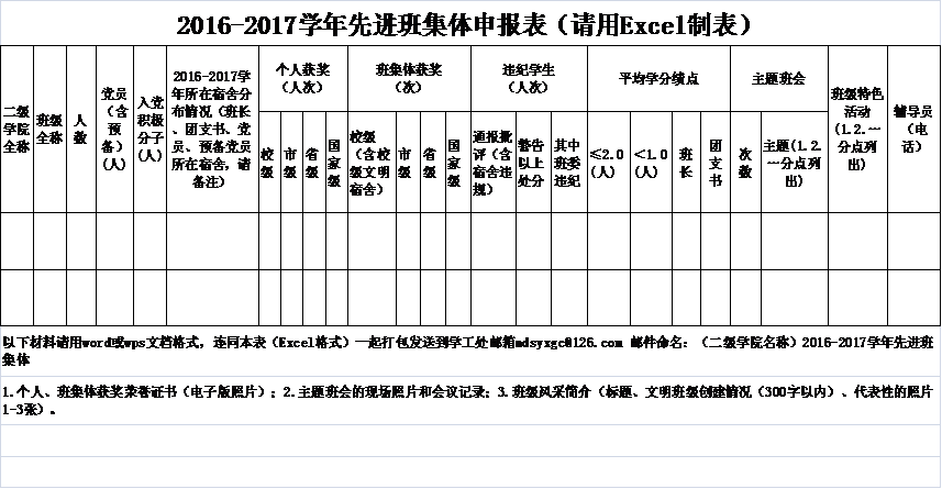 先进班集体10个,各学院推荐1-2个(名额附后)。