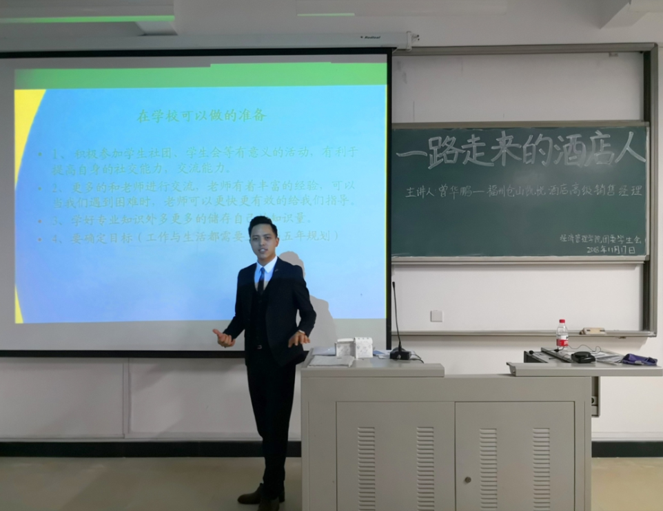 该讲座于11月17日下午在求真楼举办,由福州苍山凯悦酒店高级销售经理曾华鹏担任主讲。