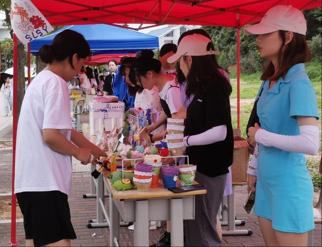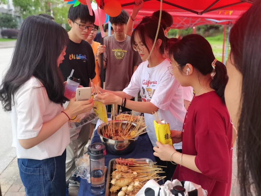 本次活动在校街舞社的表演、学院民族舞蹈表演以及歌曲串烧的精彩表演中拉开了帷幕。各小组“摊主”的经过一个多月的酝酿,充分激发自己的想法和创意,售卖自己别出心裁的商品。第18组的套圈活动吸引了大批师生围观,“顾客”站在线外进行套圈,套中的商品即可带走。其他小组的同学们手工制作的食品、精美的陶瓷等也吸引大家驻足欣赏。活动当日,天气炎热,但同学们的活动热情丝毫不减。各个摊位的摊主们将课堂所学运用到现场推销中,吆喝声此起彼伏,气氛一度高涨,现场热闹非凡。
