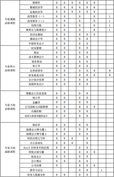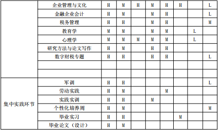 培养目标3:具备从事会计核算、内部审计、财务管理及在各大职业学校从事会计教学、科研以及会计类人员继续教育的教学等工作的能力,具有创新意识和创业精神的高级应用型专业人才。