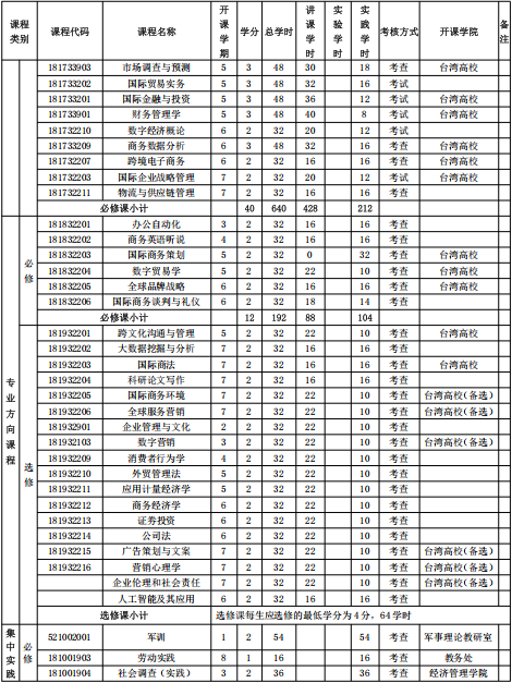 国际市场营销, 组织行为学, 金融学, 商务英语, 国际经济学, 人力资源管理, 跨国公司运营与管理, 市场调查与预测, 国际贸易实务, 国际金融与投资, 财务管理学, 数字经济概论, 商务数据分析, 跨境电子商务, 国际企业战略管理, 物流与供应链管理。