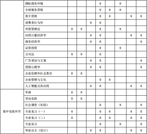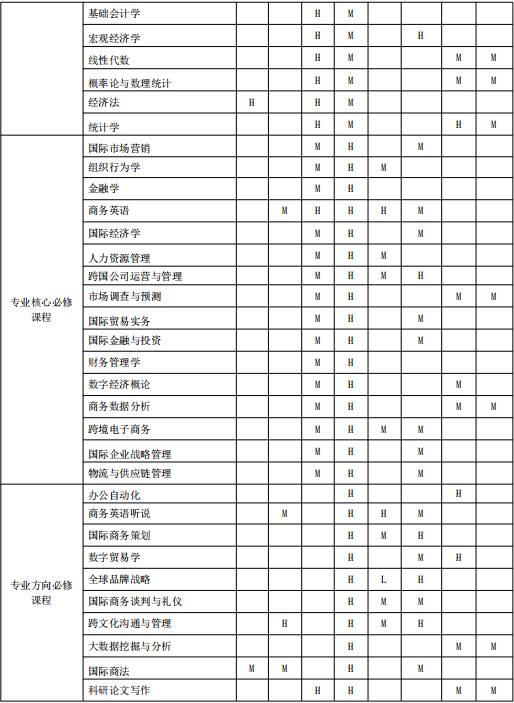 毕业要求4:专业能力。拥有国际商务领域的专业知识与操作技能,能够开展市场调查与预测、国际贸易实务、人力资源管理、国际金融与投资、财务管理、物流与供应链管理、跨境电子商务、跨国公司运营与管理等实际业务操作。