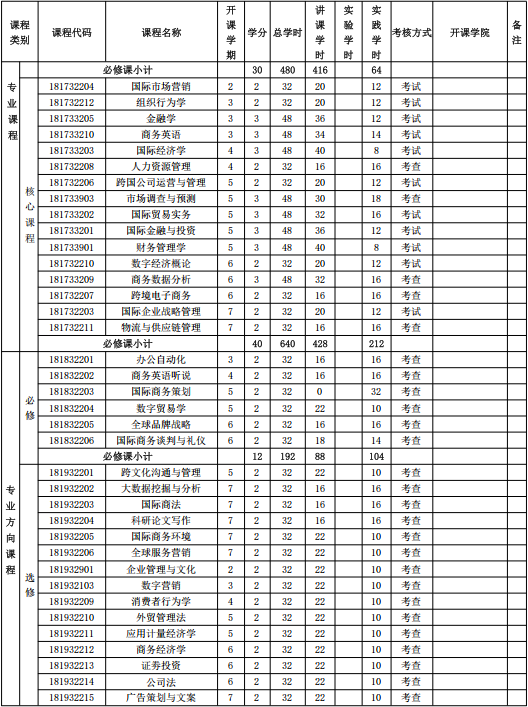 国际市场营销, 组织行为学, 金融学, 商务英语, 国际经济学, 人力资源管理, 跨国公司运营与管理, 市场调查与预测, 国际贸易实务, 国际金融与投资, 财务管理学, 数字经济概论, 商务数据分析, 跨境电子商务, 国际企业战略管理, 物流与供应链管理。