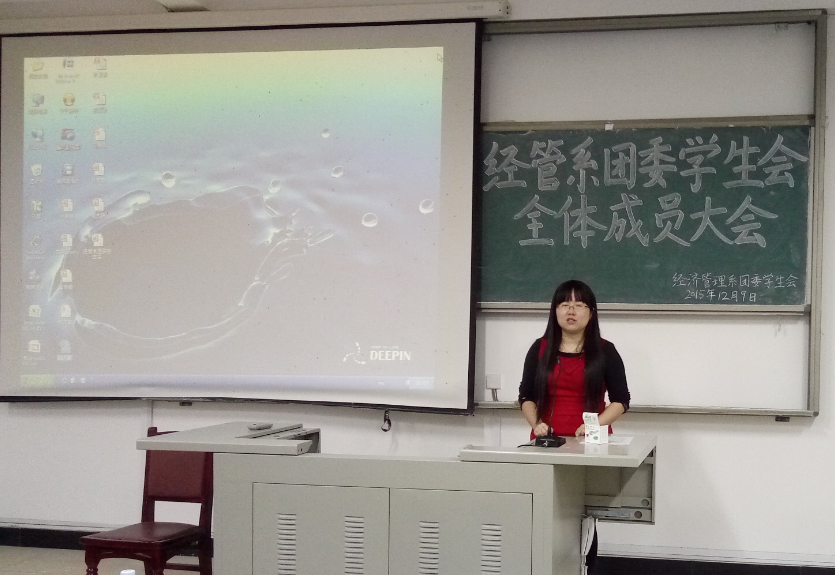2015年12月9日晚6点40分,经济管理系于求真楼Bb101召开了系团委员工会全体成员大会,出席本次会议的有系团委书记王佳佳、专职辅导员杜艳芳以及全体员工会成员。会议由团委副书记王君瑶主持