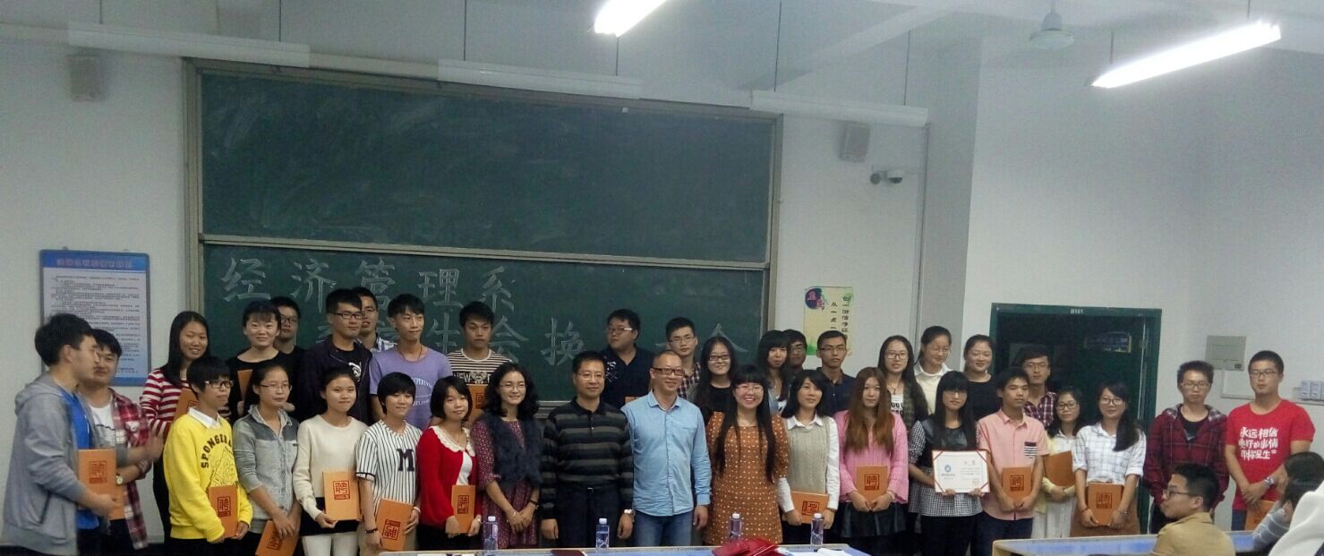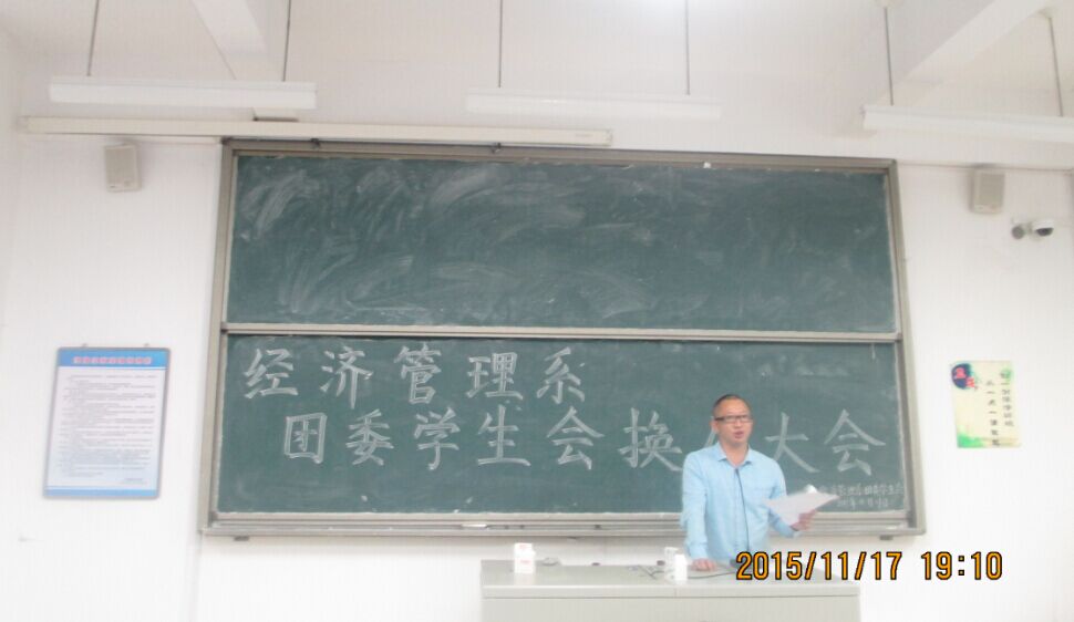 2015年11月17日晚7:00,经济管理系于求真楼Bb101进行了团委员工会换届大会。出席此次大会的有经济管理系党总支书记兼系主任游国斌、党总支副书记周建辉、团委书记王佳佳、专职辅导员杜艳芳等老师以及第五届全体团委员工会成员。
