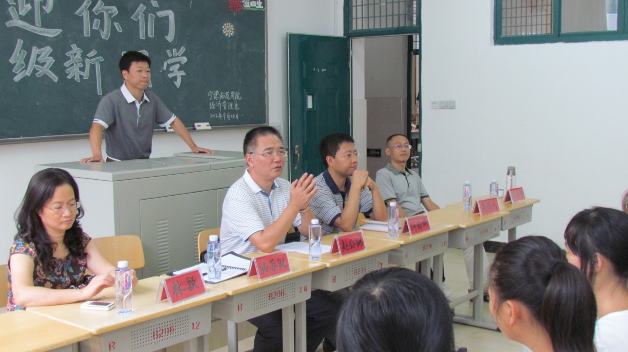 会议由我系办公室主任龚梓兵老师主持,参加会议的有宁德师院宣传部部长兼经济管理系党总支书记赵公弼老师、经济管理系主任游国斌教授、系教师党支部书记吴家林老师、系员工支部负责老师储书凯、系骨干教师马忠达老师和林颖老师、大一新生班主任袁科峰和张群、217名大一新生悉数到场。