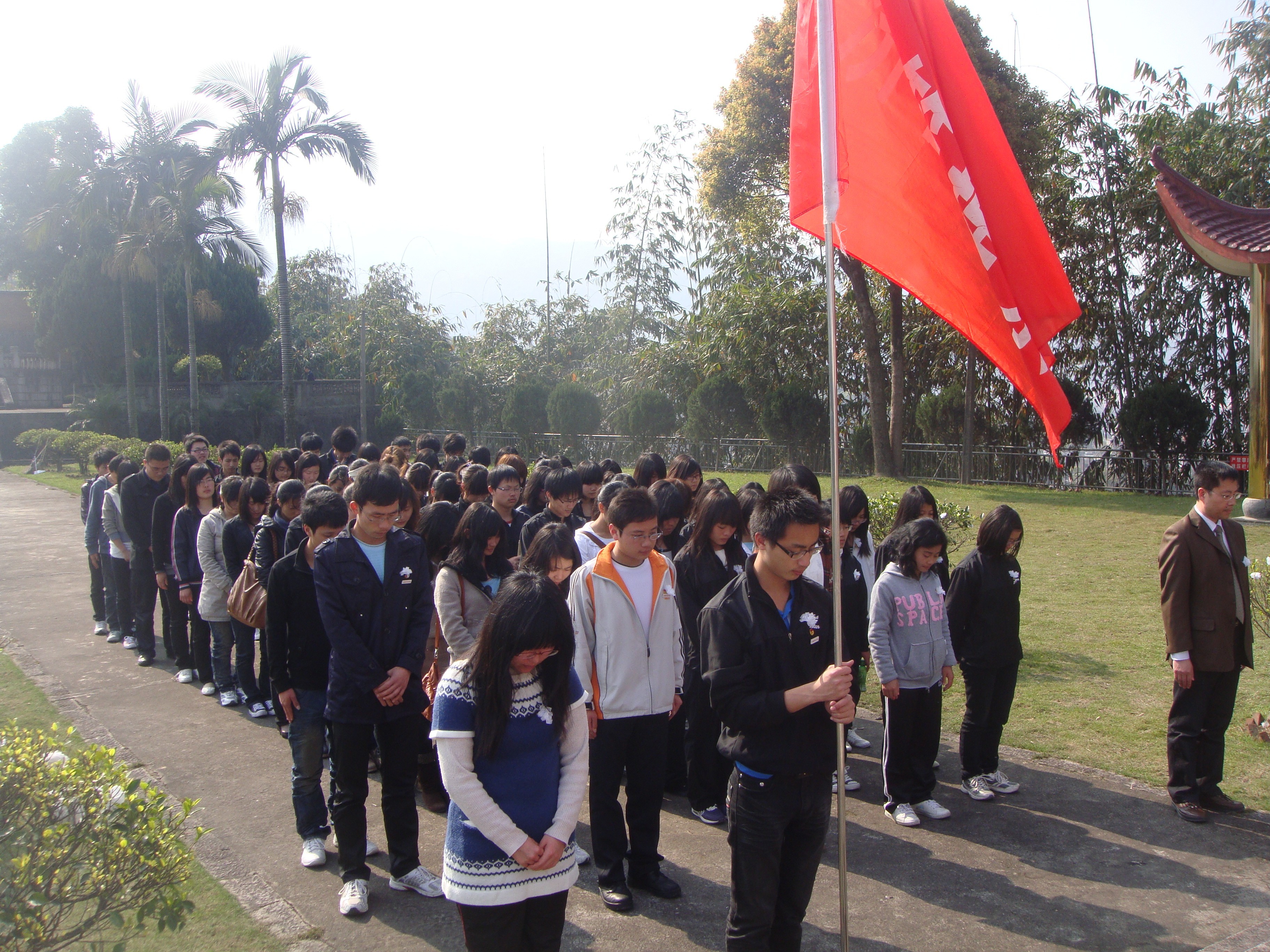 同学们清洁烈士陵园后,全体师生向革命先烈默哀三分钟,以表示对先烈的缅怀之情。再由师生代表向革命烈士墓献花圈,之后系副主任游国斌教授向全体师生讲述闽东地区解放时期的具体情况、革命烈士们的英勇事迹,以及新中国诞生后闽东地区的基本情况。
