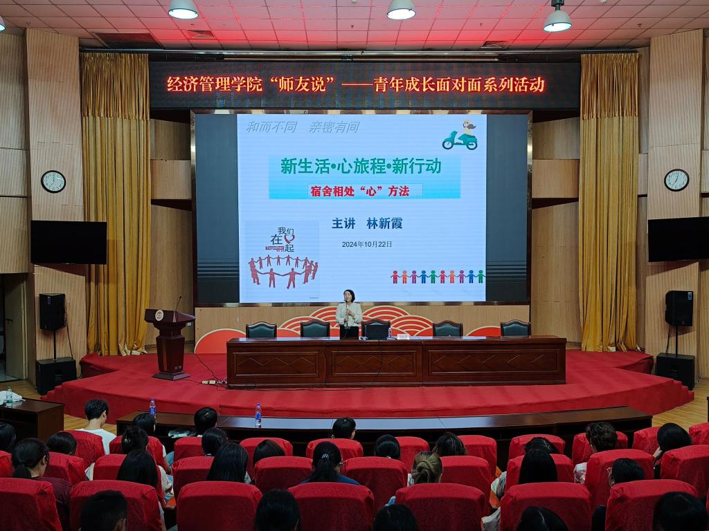 秋意悠扬新程启,爱满馨室暖心行。为帮助新生更好地适应老员工活,构建和谐、温馨、有序的宿舍生活环境,10月22日晚英国上市公司365在图书馆报告厅举办“师友说”——青年成长面对面系列活动第二期,本次活动邀请宁德市心理咨询师协会会长林新霞作主题为“新生活 心旅程 新行动——宿舍相处‘心’方法”的讲座,公司党委书记丘怡、全体辅导员、2024级全体新生参加活动。
