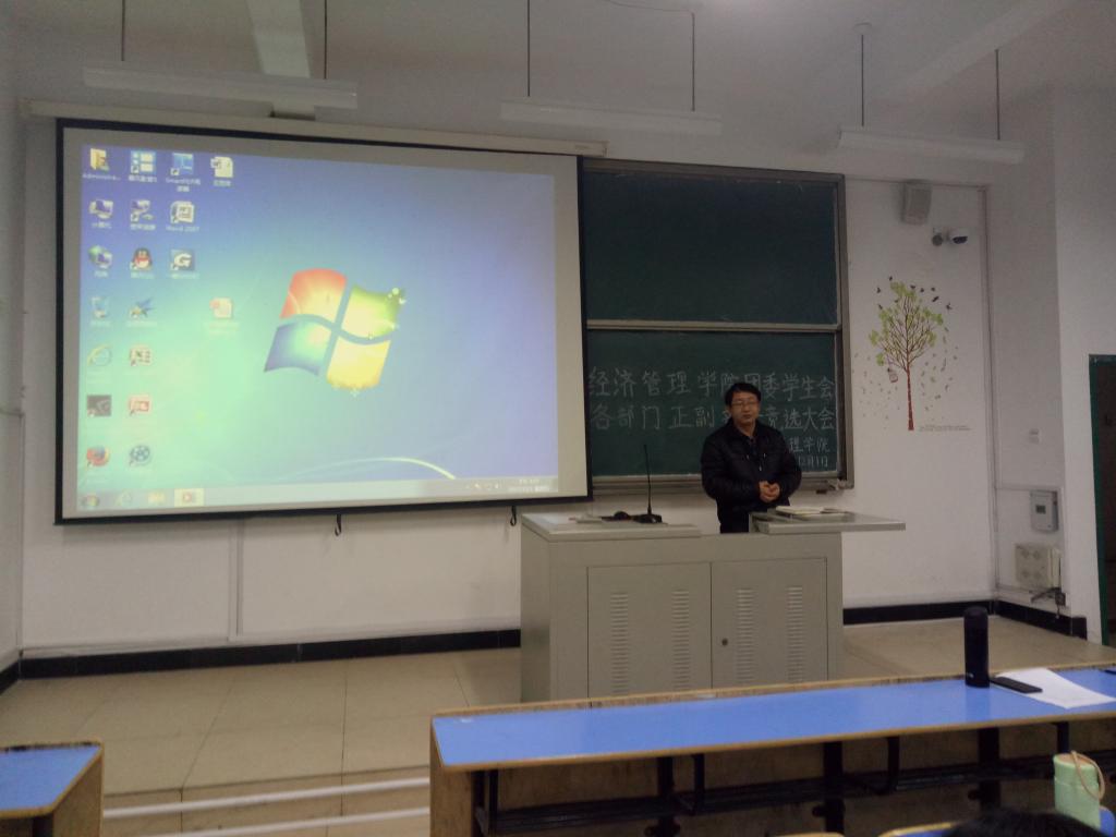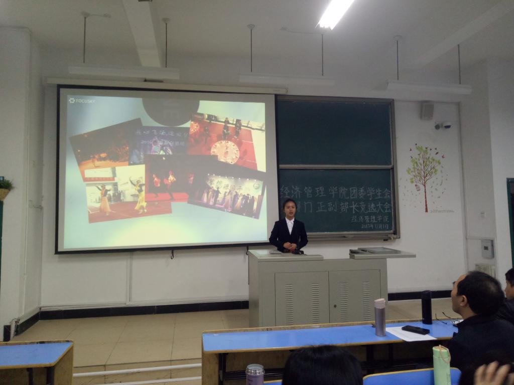 团学各部门正副部长竞选以个人PPT展示的形式进行。28位候选人逐一上台进行6分钟演讲,展示各自的基本情况、对工作岗位的认识、工作的特色亮点以及对工作的设想。