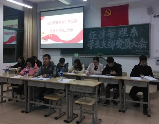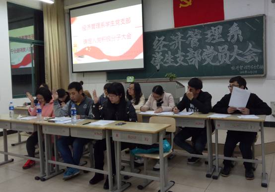 拟转为预备党员七名入党积极分子依次宣读入党宣言。李婷婷同学从小受爷爷熏陶,把加入中国共产党作为奋斗目标,通过政治理论和政策的学习更加坚定加入共产党的信念;党的全心全意为人民服务的宗旨使柯基隆同学更加明确人生观、价值观,获得优异成绩的同时参加了许多活动;王君瑶同学坚信只有党才能教育我们走上正确的社会主义道路。接收预备党员会议的第二个议程由老师发表联系人意见。杜艳芳老师认为李婷婷同学政治思想上与党保持一致,做事认真好学但有时不够细心,望能纠正。邱文君老师认为柯基隆同学品学兼优,工作认真,但为人内敛,太温和,望能改正。王佳佳老师认为唐香同学性格开朗,与人相处和谐,但工作上的精细化程度有待加强。在对发展对象的发言中,参会党员对积极分子们发表了个人的认识。最后,三名教师党员进行投票,随后公开投票结果,一致同意七名同学转为预备党员。邱文君老师表示,希望大家能在预备党员期间改进缺点,继续努力,在经济管理系建设中起到中流砥柱的作用
