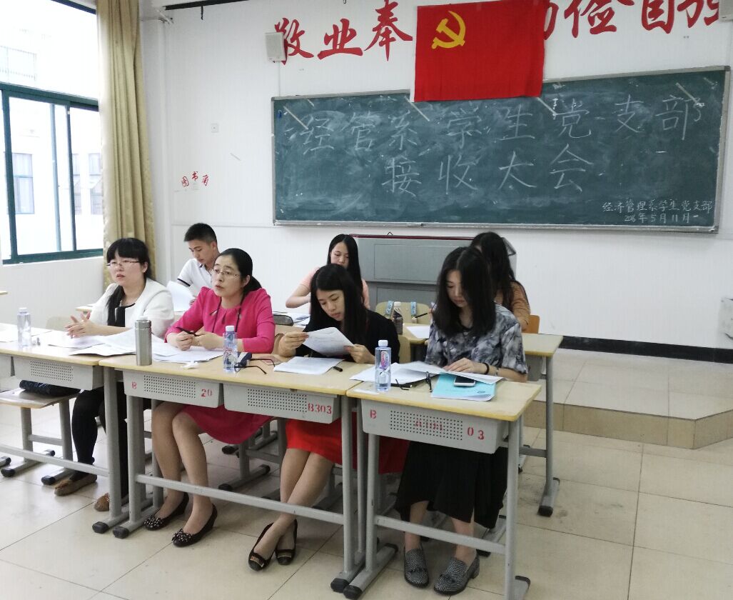 2016年5月11日下午5点,经济管理系于求真楼Bb304召开预备党员转正党内外群众讨论大会和思想汇报会、员工党员转正大会、接收预备党员大会以及“两学一做”学习教育动员会议。出席会议的有经济管理系党务秘书兼员工党支部书记周俪老师、系团委书记王佳佳老师、袁曦和孙锴老师、2名员工正式党员、11名员工预备党员、12名发展对象以及4名党外群众。