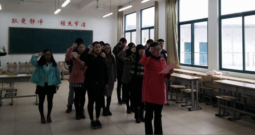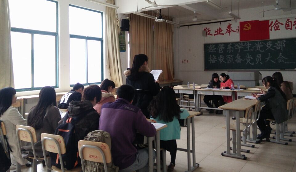 2015年12月14日下午经济管理系员工党支部接收预备党员大会在求真楼BB304教室开展。本次会议的议题是经管系员工支部接收连豪杰等8名入党积极分子为预备党员。出席此次会议的有经济管理系党务秘书兼员工党支部书记周俪、系团委书记王佳佳。周俪老师主持会议,王君瑶同学负责记录