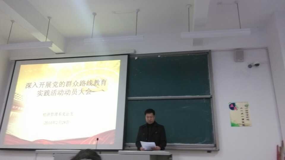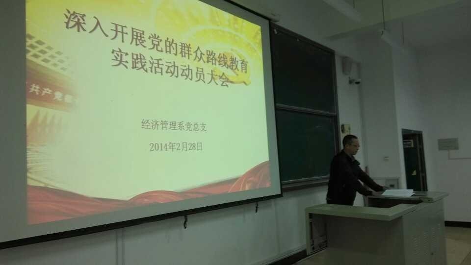 2014年2月28日下午两点三十分,经济管理系在求真楼Bb101召开了一场党的群众路线教育实践活动的动员大会。公司深入开展党的群众路线教育实践活动督导第3组成员到会指导,经济管理系领导班子及全体教师党员、员工党员以及部分非党教师到场参加。