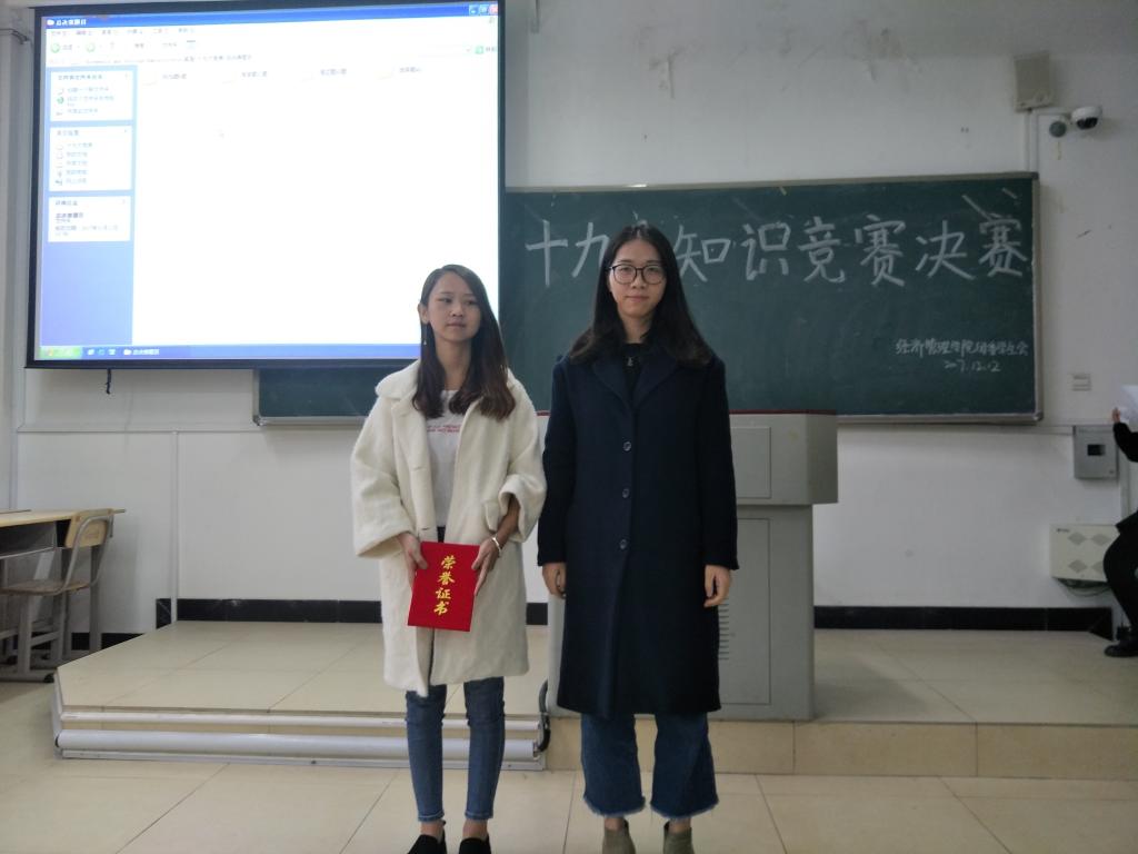 为进一步深入学习贯彻党的十九大精神,经理管理学院团委、员工会于2017年12月12日下午在求真楼举行“十九大知识竞赛(决赛)”。吴玉芳老师应邀出席,并为获奖选手颁发证书。