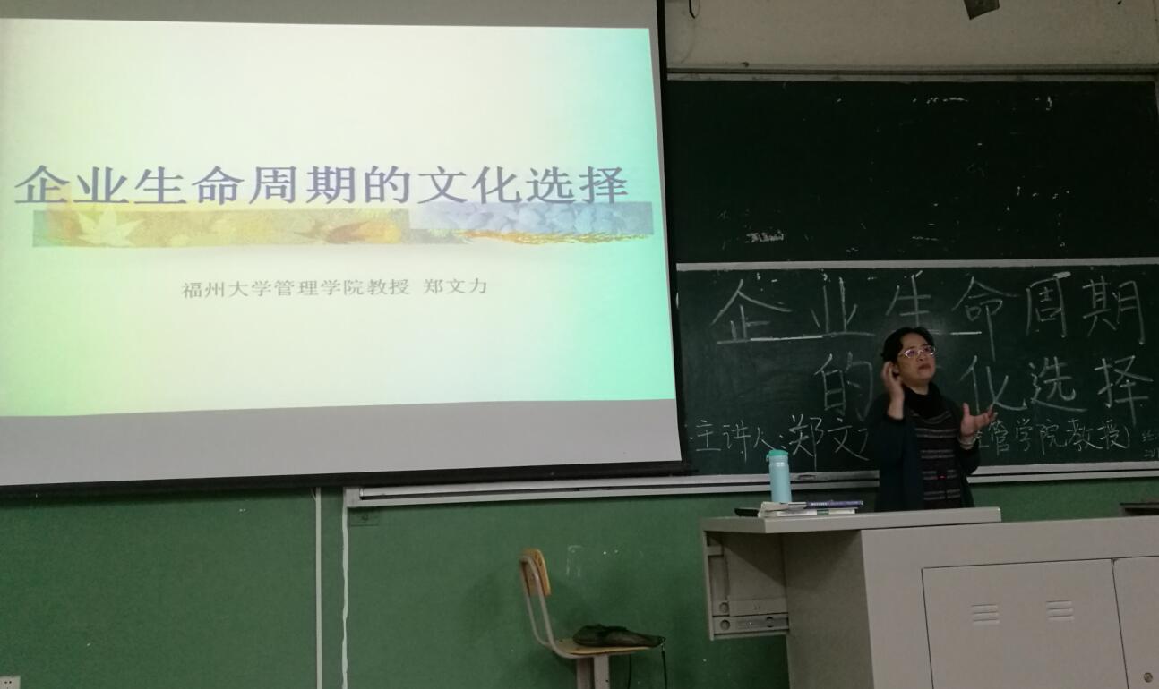 作为学校第八届“科技活动月”的一项活动内容,福州大学经济与管理学院郑文力教授应邀于12月12日下午在蕉城校区21号楼开设“企业生命周期的文化选择”专题讲座。公司游天嘉副教授主持讲座,2017级市场营销、国际商务班的全体同学参加讲座。