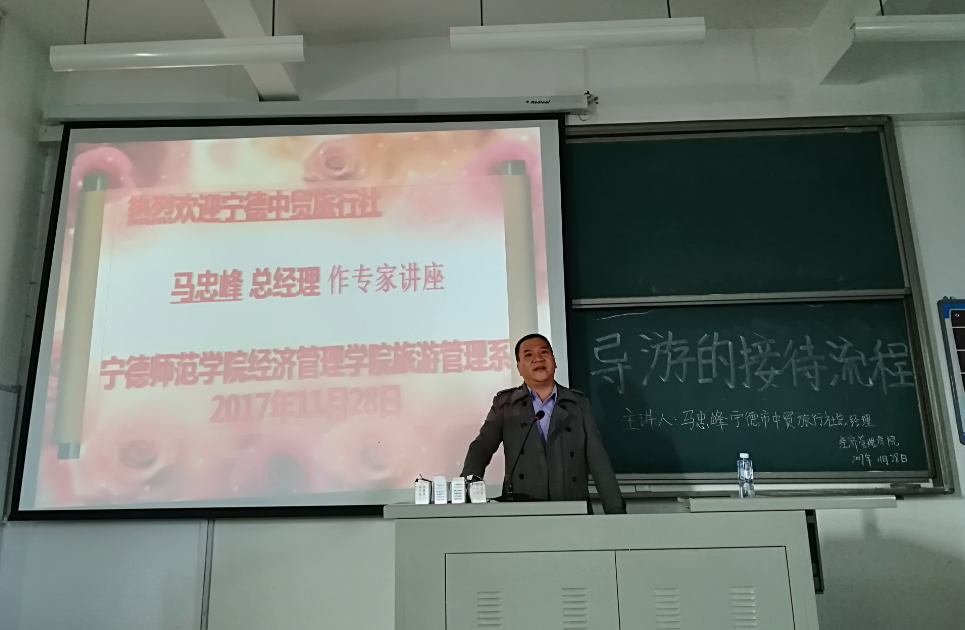 该讲座于11月28日下午在求真楼举办,系学校第八届“科技活动月”的一项活动内容,由宁德市中贸旅行社总经理马忠峰主讲,旅游管理专业16级和17级的同学们参加讲座。