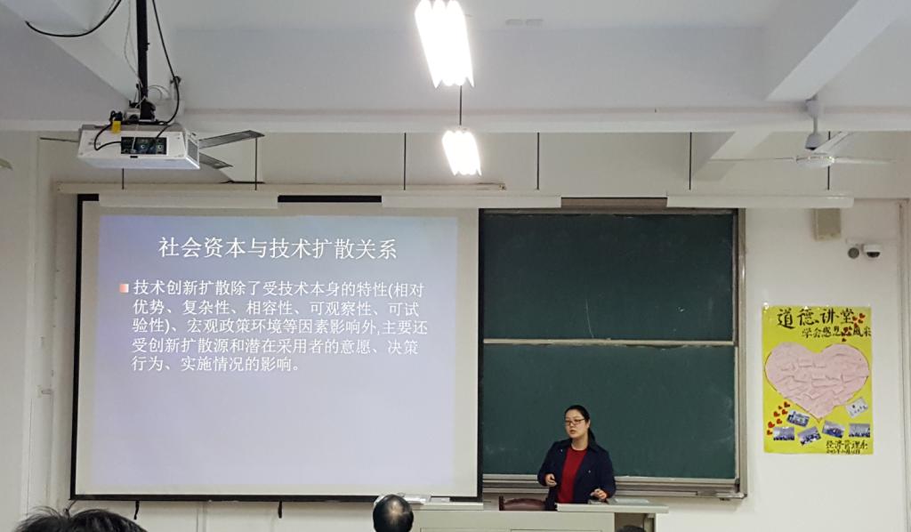 张群副教授详细介绍了社会资本的核心与内涵、社会资本与技术扩散的关系、社会资本对技术扩散的作用机制、农业可持续技术扩散的社会资本等方面的专业知识。她认为,在探讨绿色技术的扩散机制中,社会资本是对资源配置的另外一种方式,社会资本的重要意义在于能够消除完全市场机制和纯粹的政府行为所产生的外部性和逆向选择。她从社会网络、信任以及规范三个方面分析了社会资本在技术扩散中发挥的作用,同时也指出了社会资本在技术扩散中的负面效应。