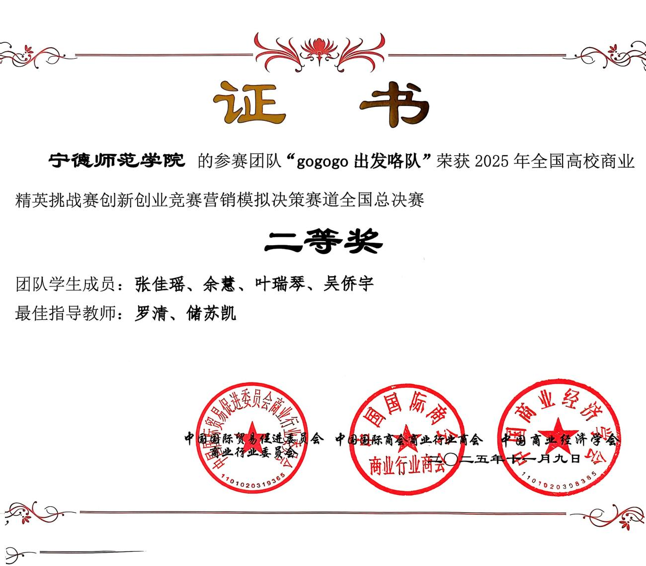 2025年11月9日,罗清老师、储苏凯老师指导的国际商务专业员工张佳瑶,叶瑞琴、余慧、吴侨宇在2025年全国高校商业精英挑战赛创新创业竞赛营销模拟决策赛道全国总决赛中获得二等奖。